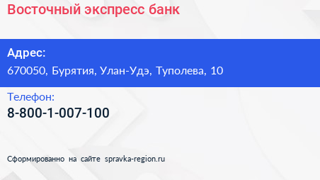 Восточный экспресс банк по адресу 670050, Бурятия, Улан-Удэ, Туполева, 10 в дальнейшем Организация, размещена в следующих категориях: