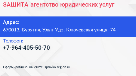 ЗАЩИТА, агентство юридических услуг по адресу 670013, Бурятия, Улан-Удэ, Ключевская улица, 74 в дальнейшем Организация, размещена в следующих категориях: