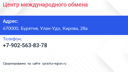 Центр международного обмена по адресу 670000, Бурятия, Улан-Удэ, Кирова, 28а в дальнейшем Организация, размещена в следующих категориях: