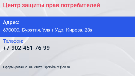 Центр защиты прав потребителей по адресу 670000, Бурятия, Улан-Удэ, Кирова, 28а в дальнейшем Организация, размещена в следующих категориях: