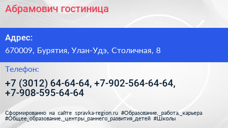 Абрамович, гостиница по адресу 670009, Бурятия, Улан-Удэ, Столичная, 8 в дальнейшем Организация, размещена в следующих категориях: