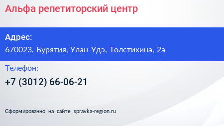 Альфа, репетиторский центр по адресу 670023, Бурятия, Улан-Удэ, Толстихина, 2а в дальнейшем Организация, размещена в следующих категориях: