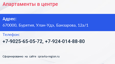 Апартаменты в центре по адресу 670000, Бурятия, Улан-Удэ, Банзарова, 12а/1 в дальнейшем Организация, размещена в следующих категориях: