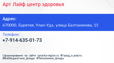 Арт Лайф, центр здоровья по адресу 670000, Бурятия, Улан-Удэ, улица Балтахинова, 15 в дальнейшем Организация, размещена в следующих категориях:
