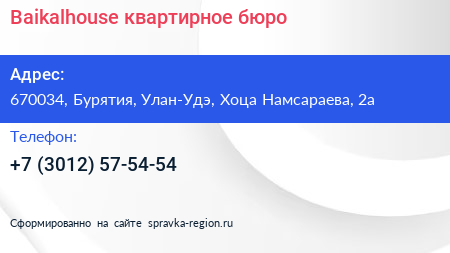 Baikalhouse, квартирное бюро по адресу 670034, Бурятия, Улан-Удэ, Хоца Намсараева, 2а в дальнейшем Организация, размещена в следующих категориях:
