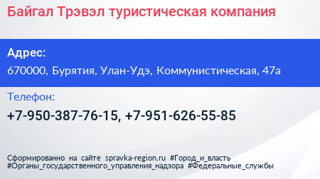 Байгал Трэвэл, туристическая компания по адресу 670000, Бурятия, Улан-Удэ, Коммунистическая, 47а в дальнейшем Организация, размещена в следующих категориях: