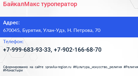 БайкалМакс, туроператор по адресу 670045, Бурятия, Улан-Удэ, Н. Петрова, 70 в дальнейшем Организация, размещена в следующих категориях: