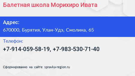 Балетная школа Морихиро Ивата по адресу 670000, Бурятия, Улан-Удэ, Смолина, 65 в дальнейшем Организация, размещена в следующих категориях: