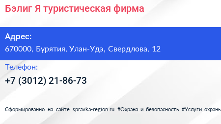 Бэлиг-Я, туристическая фирма по адресу 670000, Бурятия, Улан-Удэ, Свердлова, 12 в дальнейшем Организация, размещена в следующих категориях: