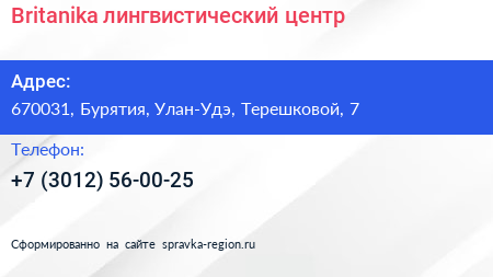 Britanika, лингвистический центр по адресу 670031, Бурятия, Улан-Удэ, Терешковой, 7 в дальнейшем Организация, размещена в следующих категориях: