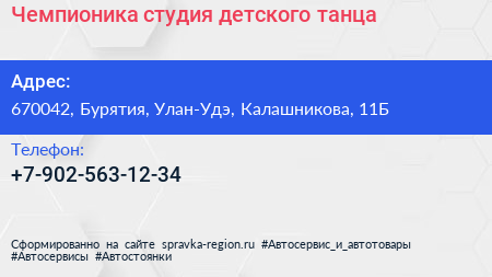 Чемпионика, студия детского танца по адресу 670042, Бурятия, Улан-Удэ, Калашникова, 11Б в дальнейшем Организация, размещена в следующих категориях: