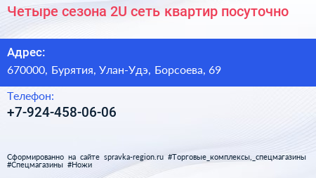 Четыре сезона-2U, сеть квартир посуточно по адресу 670000, Бурятия, Улан-Удэ, Борсоева, 69 в дальнейшем Организация, размещена в следующих категориях: