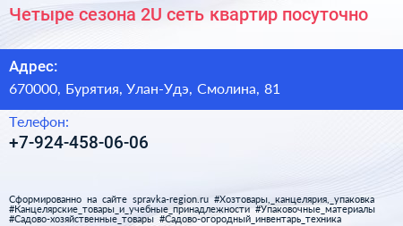 Четыре сезона-2U, сеть квартир посуточно по адресу 670000, Бурятия, Улан-Удэ, Смолина, 81 в дальнейшем Организация, размещена в следующих категориях: