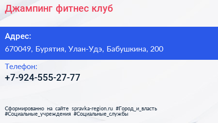 Джампинг, фитнес-клуб по адресу 670049, Бурятия, Улан-Удэ, Бабушкина, 200 в дальнейшем Организация, размещена в следующих категориях: