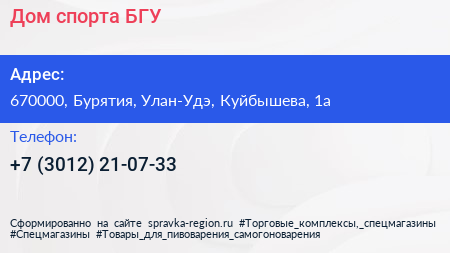 Дом спорта, БГУ по адресу 670000, Бурятия, Улан-Удэ, Куйбышева, 1а в дальнейшем Организация, размещена в следующих категориях: