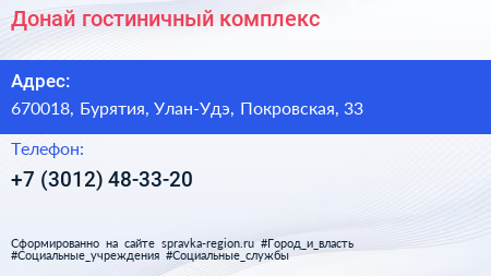 Донай, гостиничный комплекс по адресу 670018, Бурятия, Улан-Удэ, Покровская, 33 в дальнейшем Организация, размещена в следующих категориях: