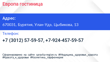 Европа, гостиница по адресу 670031, Бурятия, Улан-Удэ, Цыбикова, 13 в дальнейшем Организация, размещена в следующих категориях: