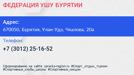 ФЕДЕРАЦИЯ УШУ БУРЯТИИ по адресу 670050, Бурятия, Улан-Удэ, Чкалова, 20а в дальнейшем Организация, размещена в следующих категориях: