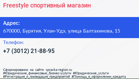 Freestyle, спортивный магазин по адресу 670000, Бурятия, Улан-Удэ, улица Балтахинова, 15 в дальнейшем Организация, размещена в следующих категориях: