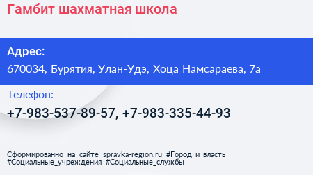 Гамбит, шахматная школа по адресу 670034, Бурятия, Улан-Удэ, Хоца Намсараева, 7а в дальнейшем Организация, размещена в следующих категориях: