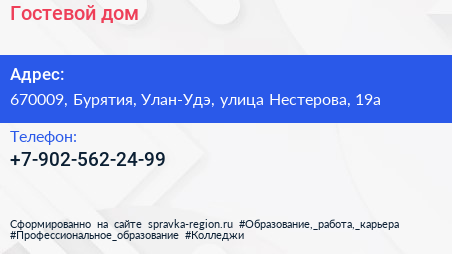 Гостевой дом по адресу 670009, Бурятия, Улан-Удэ, улица Нестерова, 19а в дальнейшем Организация, размещена в следующих категориях: