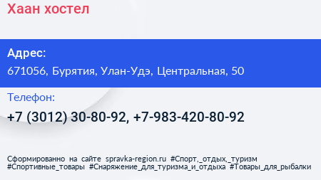 Хаан, хостел по адресу 671056, Бурятия, Улан-Удэ, Центральная, 50 в дальнейшем Организация, размещена в следующих категориях: