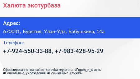 Халюта, экотурбаза по адресу 670031, Бурятия, Улан-Удэ, Бабушкина, 14а в дальнейшем Организация, размещена в следующих категориях: