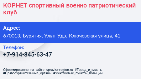 КОРНЕТ, спортивный военно-патриотический клуб по адресу 670013, Бурятия, Улан-Удэ, Ключевская улица, 41 в дальнейшем Организация, размещена в следующих категориях: