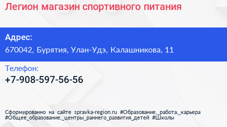 Легион, магазин спортивного питания по адресу 670042, Бурятия, Улан-Удэ, Калашникова, 11 в дальнейшем Организация, размещена в следующих категориях:
