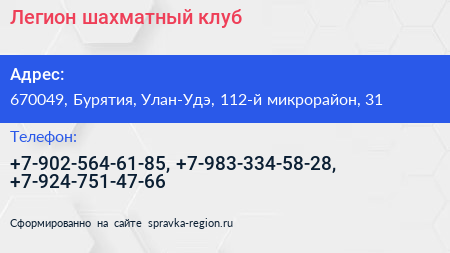 Легион, шахматный клуб по адресу 670049, Бурятия, Улан-Удэ, 112-й микрорайон, 31 в дальнейшем Организация, размещена в следующих категориях: