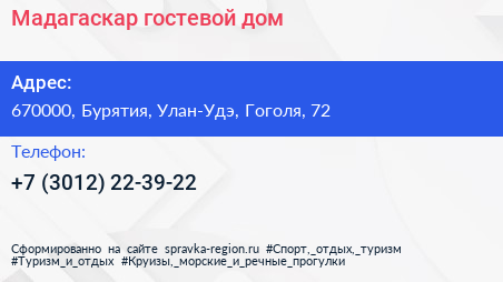 Мадагаскар, гостевой дом по адресу 670000, Бурятия, Улан-Удэ, Гоголя, 72 в дальнейшем Организация, размещена в следующих категориях: