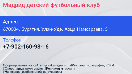 Мадрид, детский футбольный клуб по адресу 670034, Бурятия, Улан-Удэ, Хоца Намсараева, 5 в дальнейшем Организация, размещена в следующих категориях: