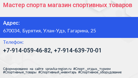 Мастер спорта, магазин спортивных товаров по адресу 670034, Бурятия, Улан-Удэ, Гагарина, 25 в дальнейшем Организация, размещена в следующих категориях: