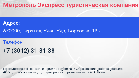 Метрополь-Экспресс, туристическая компания по адресу 670000, Бурятия, Улан-Удэ, Борсоева, 19Б в дальнейшем Организация, размещена в следующих категориях:
