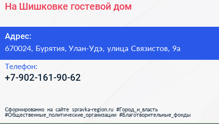 На Шишковке, гостевой дом по адресу 670024, Бурятия, Улан-Удэ, улица Связистов, 9а в дальнейшем Организация, размещена в следующих категориях: