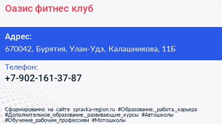 Оазис, фитнес-клуб по адресу 670042, Бурятия, Улан-Удэ, Калашникова, 11Б в дальнейшем Организация, размещена в следующих категориях:
