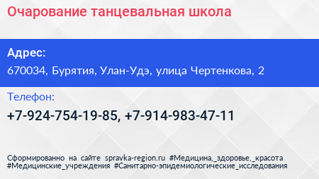 Очарование, танцевальная школа по адресу 670034, Бурятия, Улан-Удэ, улица Чертенкова, 2 в дальнейшем Организация, размещена в следующих категориях: