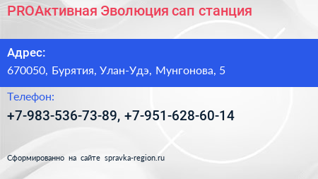 PROАктивная Эволюция, сап-станция по адресу 670050, Бурятия, Улан-Удэ, Мунгонова, 5 в дальнейшем Организация, размещена в следующих категориях: