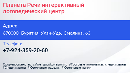 Планета Речи, интерактивный логопедический центр по адресу 670000, Бурятия, Улан-Удэ, Смолина, 63 в дальнейшем Организация, размещена в следующих категориях: