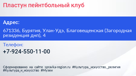 Пластун, пейнтбольный клуб по адресу 671336, Бурятия, Улан-Удэ, Благовещенская (Загородная резиденция днп), 4 в дальнейшем Организация, размещена в следующих категориях: