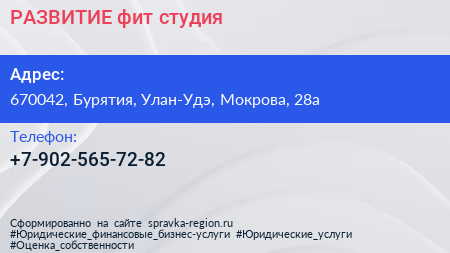 РАЗВИТИЕ, фит-студия по адресу 670042, Бурятия, Улан-Удэ, Мокрова, 28а в дальнейшем Организация, размещена в следующих категориях: