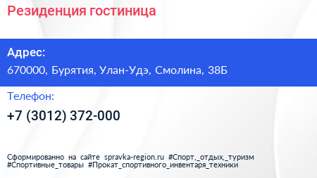 Резиденция, гостиница по адресу 670000, Бурятия, Улан-Удэ, Смолина, 38Б в дальнейшем Организация, размещена в следующих категориях: