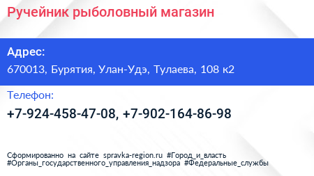 Ручейник, рыболовный магазин по адресу 670013, Бурятия, Улан-Удэ, Тулаева, 108 к2 в дальнейшем Организация, размещена в следующих категориях: