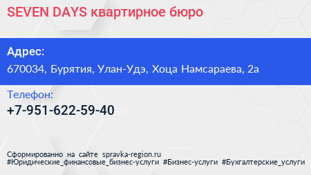 SEVEN DAYS, квартирное бюро по адресу 670034, Бурятия, Улан-Удэ, Хоца Намсараева, 2а в дальнейшем Организация, размещена в следующих категориях: