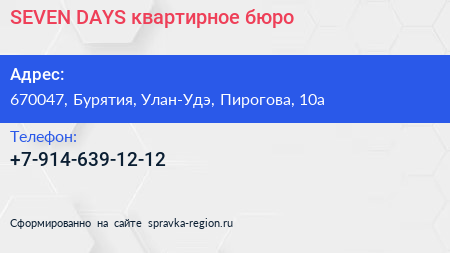SEVEN DAYS, квартирное бюро по адресу 670047, Бурятия, Улан-Удэ, Пирогова, 10а в дальнейшем Организация, размещена в следующих категориях: