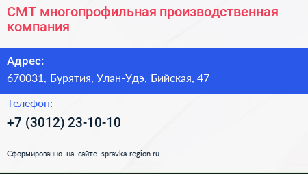 СМТ, многопрофильная производственная компания по адресу 670031, Бурятия, Улан-Удэ, Бийская, 47 в дальнейшем Организация, размещена в следующих категориях:
