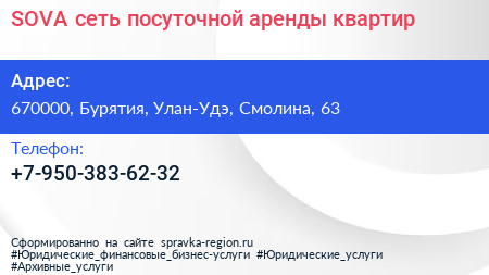 SOVA, сеть посуточной аренды квартир по адресу 670000, Бурятия, Улан-Удэ, Смолина, 63 в дальнейшем Организация, размещена в следующих категориях: