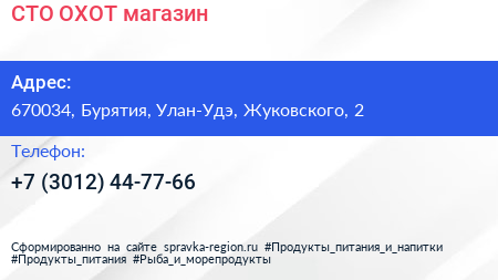 СТО ОХОТ, магазин по адресу 670034, Бурятия, Улан-Удэ, Жуковского, 2 в дальнейшем Организация, размещена в следующих категориях: