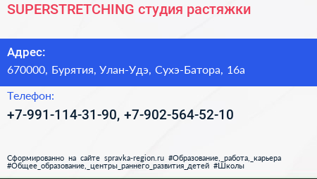 SUPERSTRETCHING, студия растяжки по адресу 670000, Бурятия, Улан-Удэ, Сухэ-Батора, 16а в дальнейшем Организация, размещена в следующих категориях: