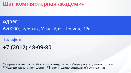 Шаг, компьютерная академия по адресу 670000, Бурятия, Улан-Удэ, Ленина, 49а в дальнейшем Организация, размещена в следующих категориях: